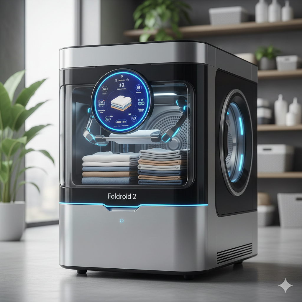 Foldroidの2代目は、まさに家事の革命児となりました。これまで部分的に自動化されていた洗濯工程を、洗う・乾燥・畳む・仕分けるまで一台で完結させることに成功し、「洗濯という概念を消した家電」として社会現象的ヒットになりました。